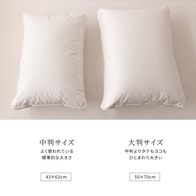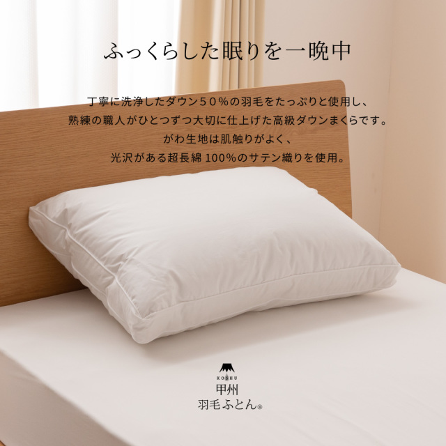 - 世界遺産「富士山」の麓で作られた高級ダウンまくらです。丁寧に洗浄したダウン50%の羽毛をたっぷりと使用し、熟練の職人がひとつずつ大切に仕上げた逸品です。がわ生地は肌触りがよく、光沢がある超長綿100%のサテン織りを使用。二重合わせ生地構造のため羽毛の吹き出しを防止し、周囲は高級感のあるパイピング加工を施しております。サイズは一般的な中判サイズとひとまわり大きな大判サイズからお選びいただけます。柔らかででふっくらとしたタイプのまくらがお好みの方に特にお勧めします。