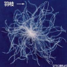2.グースの方がダウンの羽枝、小羽枝が多くて細く柔らかい。ドレープ性に富んでいる。グースの小羽枝は2ミクロン、ダックは4ミクロン