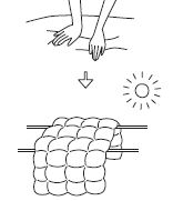 羽毛布団は、天日に干すか、または、風通しの良い日陰に干してください。月に1~2回、天気のよい乾燥した日に、午前10時から午後3時ごろまでに干すのがおすすめです。片面1時間くらいを目安に、両面干ししてください。羽毛布団のがわ生地の傷みや汚れを防ぐためには、シーツやカバーでおおった状態で干すのが効果的です。こうすることで、がわ生地の傷みを防ぐことが出来ます。また、よく羽毛布団を干したあとに、パンパンと強くたたいている方を見かけます。がわ生地や中身の羽毛が傷みますので、絶対にたたかないでください。